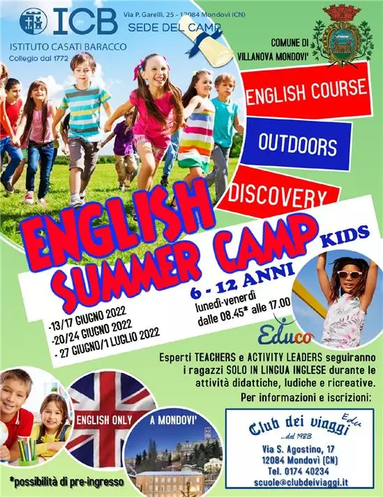 In occasione della presentazione degli English Summer Camp, il Collegio Casati Baracco e l’agenzia Club dei Viaggi di Mondovì, con il patrocinio del Comune di Villanova Mondovì, sono lieti di invitare ad un incontro informativo tutte le famiglie interessate, il giorno martedì 22 marzo 2022 alle ore 18.00 presso la Biblioteca Civica in Piazza Filippi,7 a Villanova Mondovì.