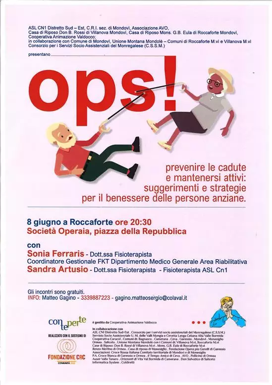 In seno alle attività previste dal progetto “Con Te Per Te” (gestito dalla Cooperativa Valdocco, realizzato con il sostegno della Fondazione CRC nell’ambito del Bando Comunità 2030 e pensato per rafforzare una rete articolata di servizi a sostegno della domiciliarità delle persone ultrasessantacinquenni), si segnala l’incontro “Ops!” previsto per il prossimo 8 giugno alle ore 20.30 presso la Società Operaia di Roccaforte Mondovì.
