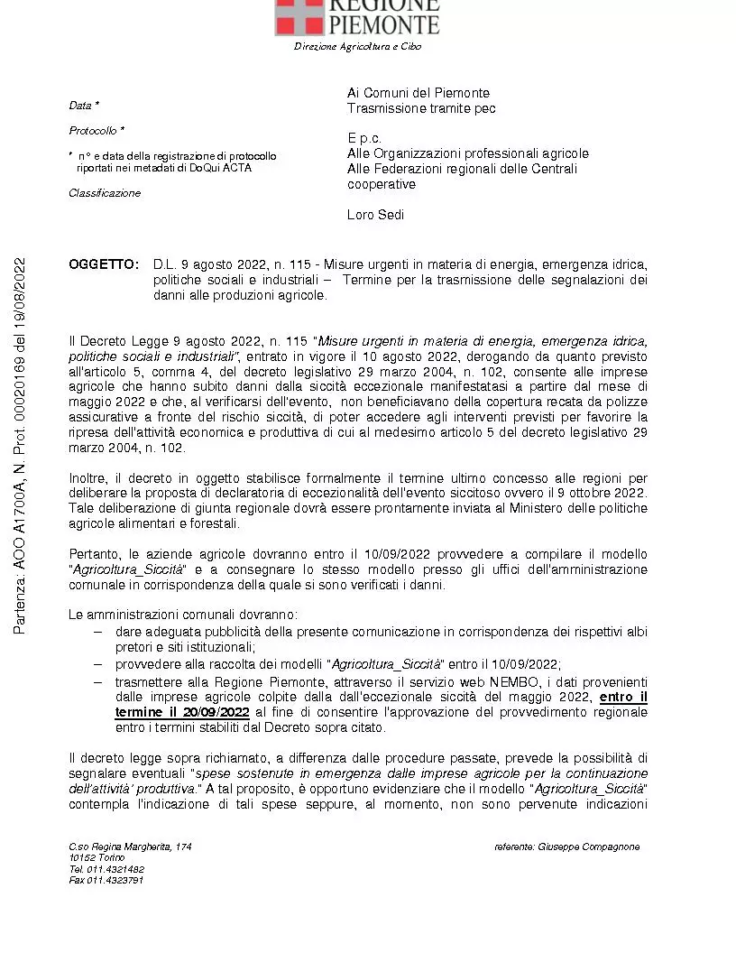 Le aziende agricole dovranno entro il 10/09/2022 provvedere a compilare il modello “Agricoltura_Siccità” (allegato) e a consegnare lo stesso modello presso gli uffici dell’amministrazione comunale in corrispondenza della quale si sono verificati i danni.