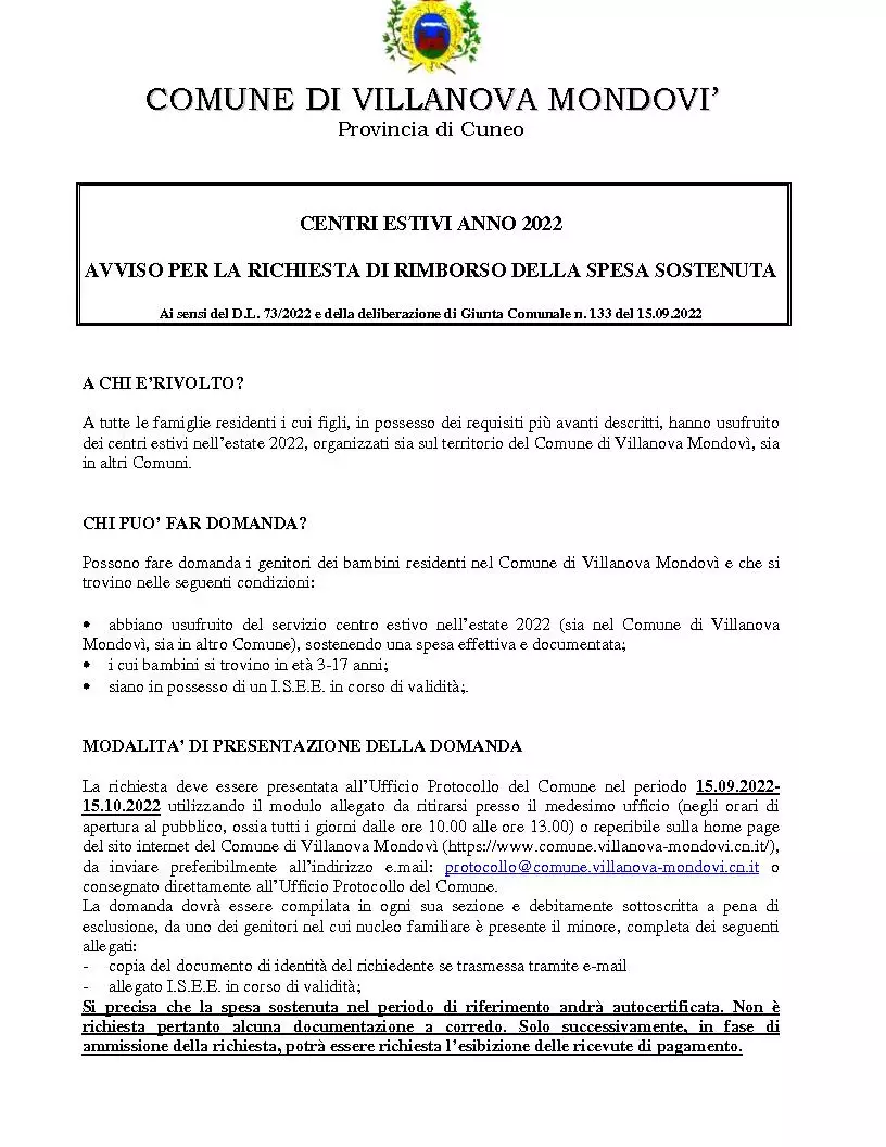 abbiano usufruito del servizio centro estivo nell’estate 2022 (sia nel Comune di Villanova