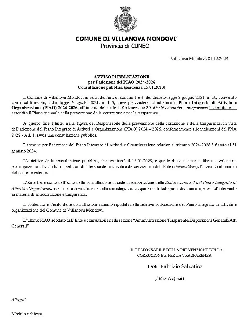 Descrizione Si pubblicano l'avviso pubblicazione per l’adozione del PIAO 2024-2026 - Consultazione pubblica ed il modello per la presentazione di proposte e osservazioni.