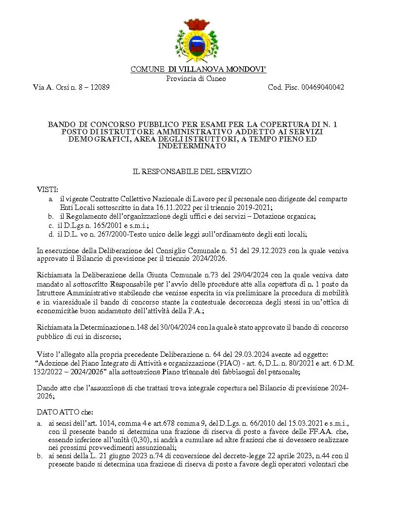 Bando di concorso pubblico per esami per la copertura di n. 1 posto di istruttore amministrativo, addetto ai servizi demografici a tempo pieno ed indeterminato