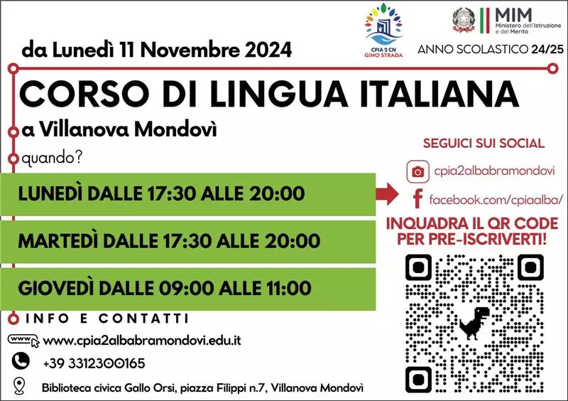 Da Lunedì 11 novembre 2024 partono i CORSI DI LINGUA ITALIANA, tenuti da docenti del C.P.I.A. 2 CUNEO Alba-Mondovì Gino Strada, presso i locali della Biblioteca Civica di Villanova Mondovì, nei seguenti orari: