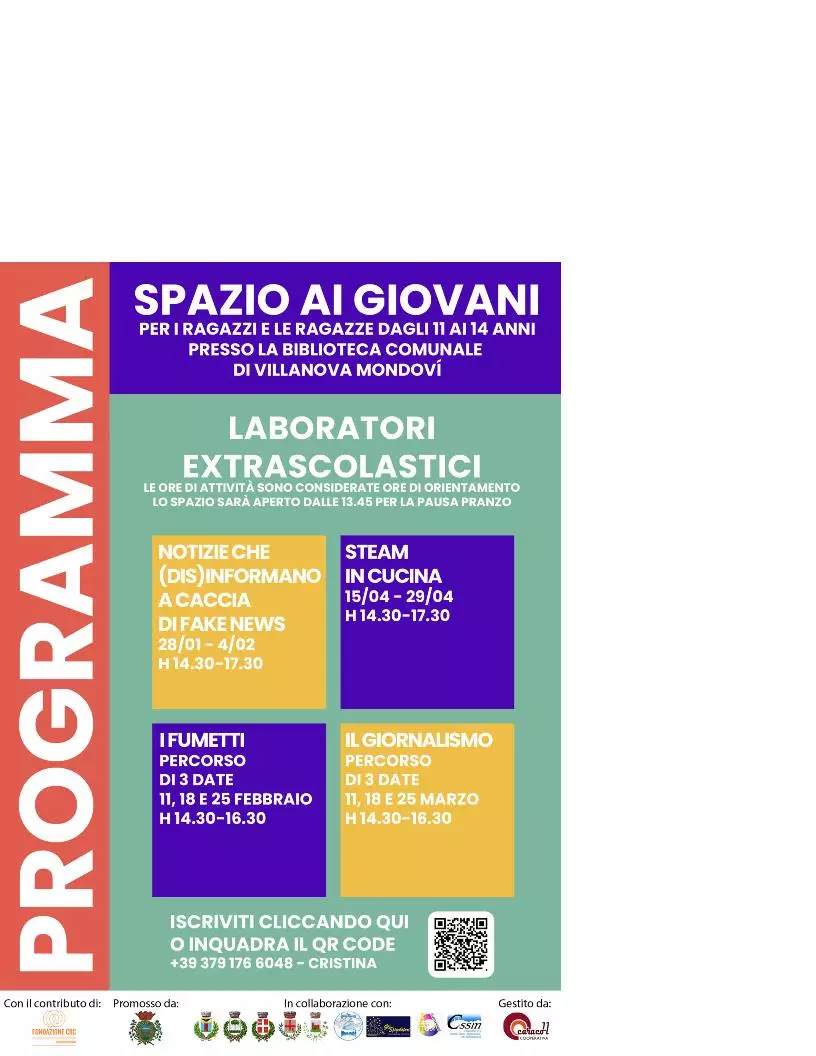 Ecco i laboratori di orientamento che si svolgeranno grazie al progetto Spazio ai Giovani presso la Biblioteca di Villanova Mondovì. Le ore di laboratorio rientrano all'interno delle proposte di orientamento dell' Istituto Comprensivo di Villanova Mondovì per avvicinare i ragazzi alle loro passioni ed orientare i loro percorsi di studio futuri. L'iscrizione va fatta sul Google moduli che troverete al link sulla locandina. Vi aspettiamo numerosi!